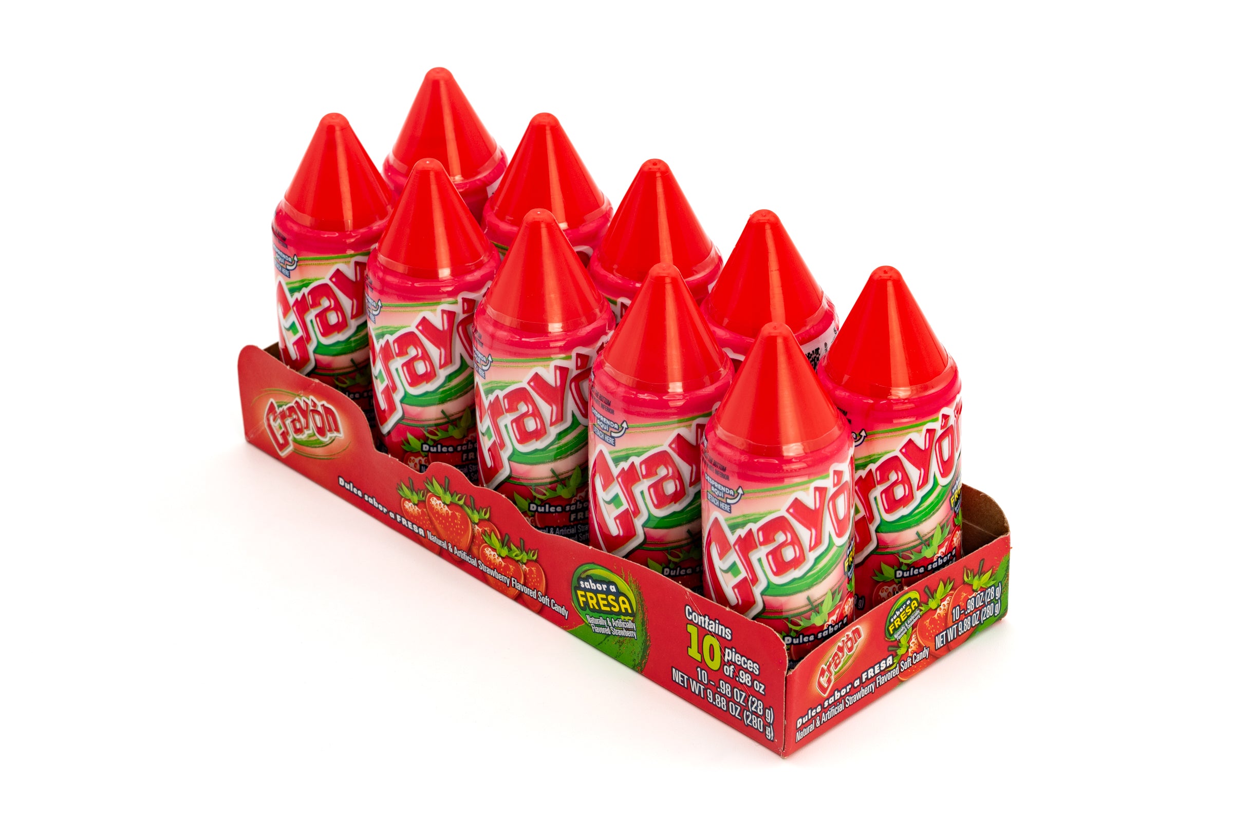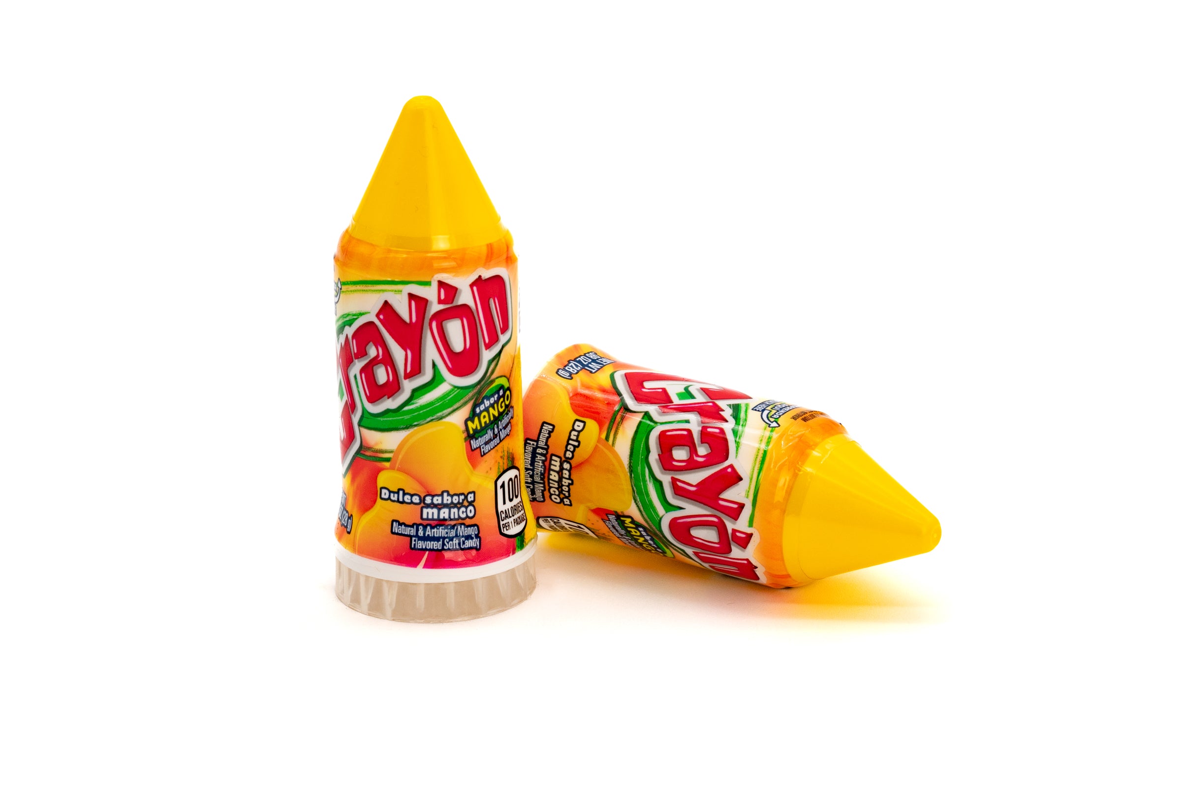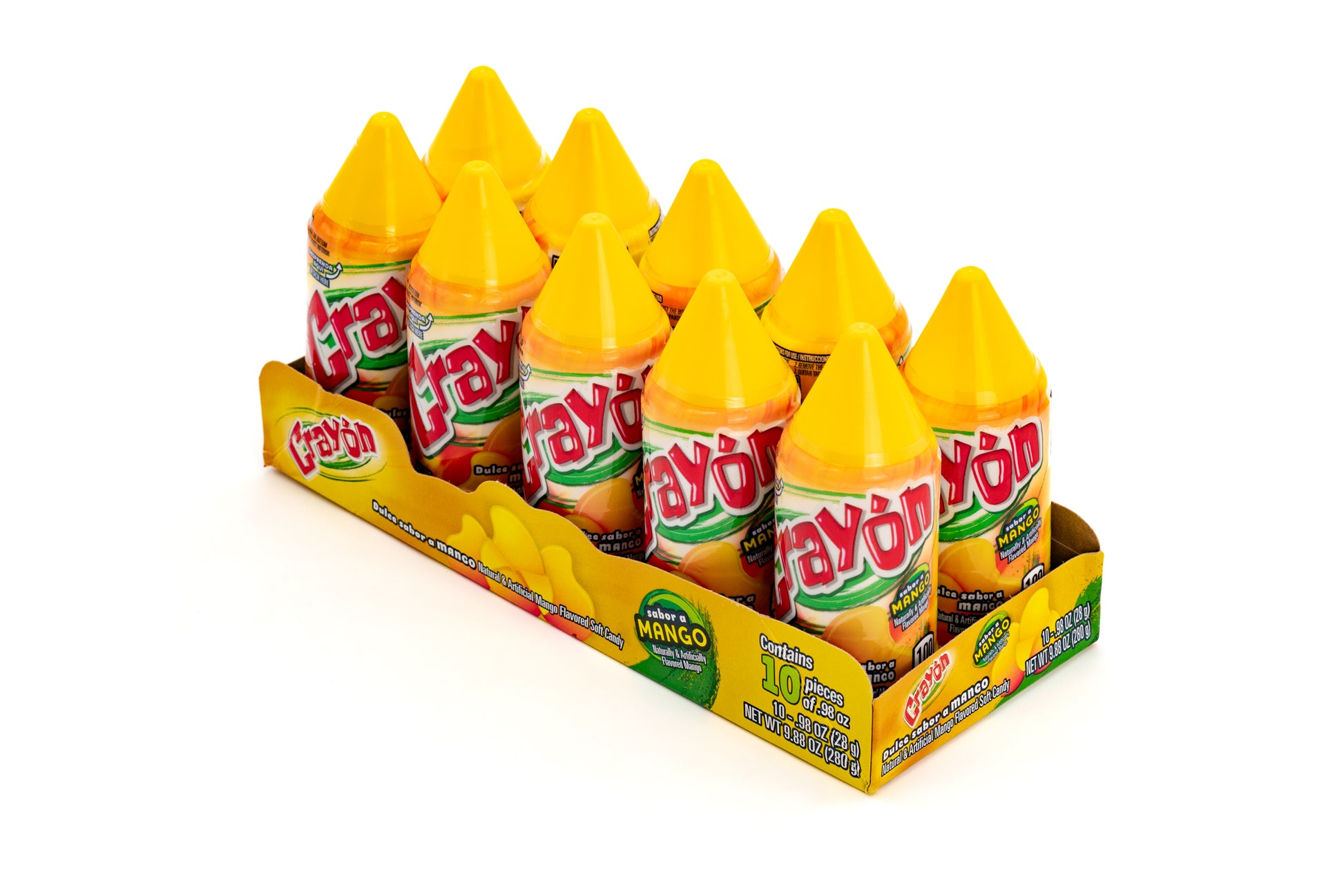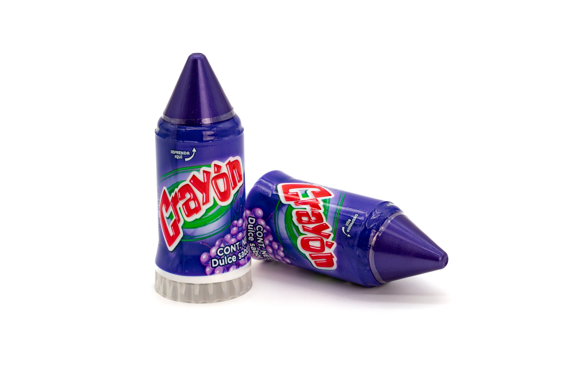 Soft, fruity Mexican candy shaped like crayons, in bright colors and flavors like grape, mango, and strawberry. The crayon-shaped packaging has a removable tip to reveal the candy.