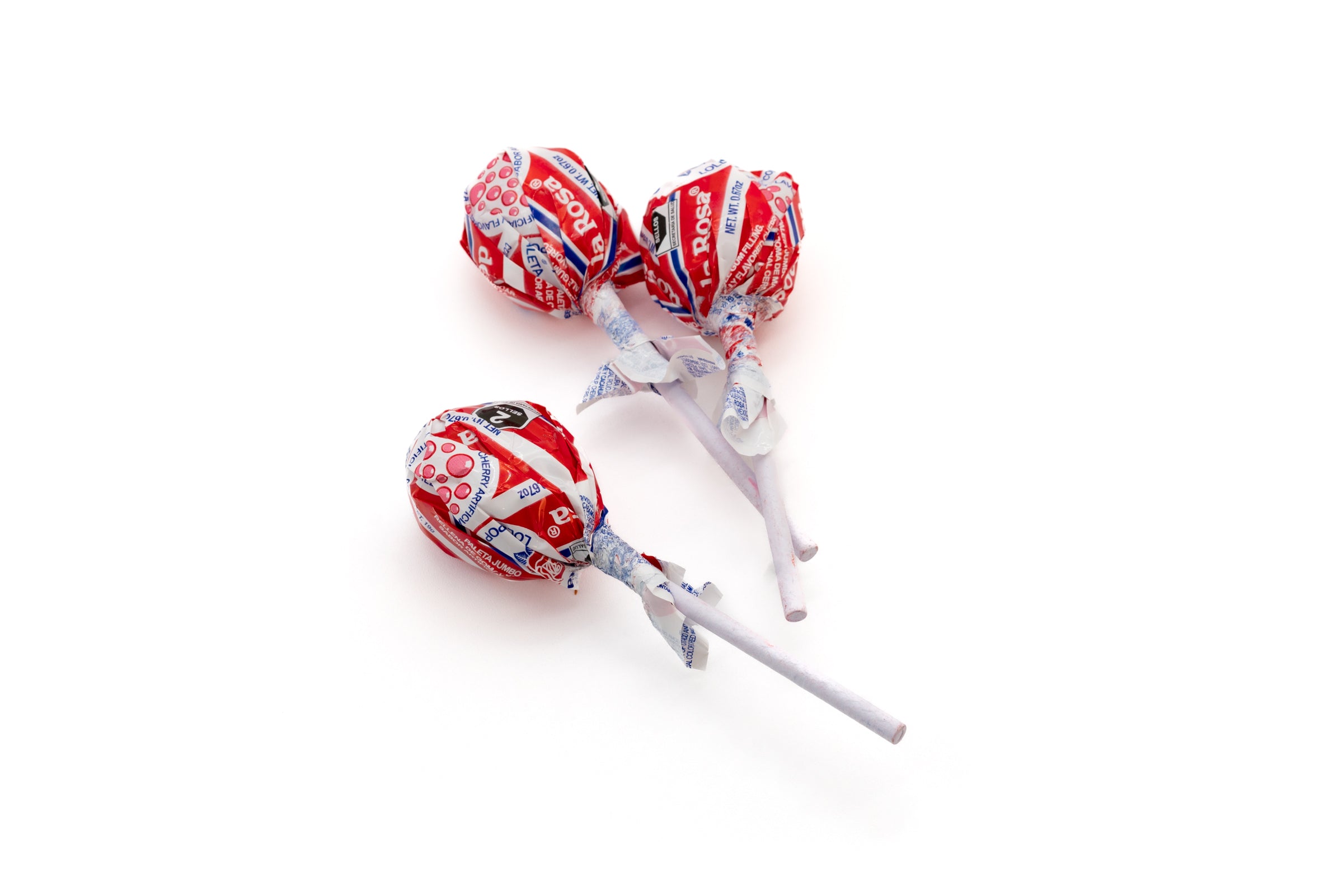 A large, red, cherry-flavored lollipop with a chewy bubblegum center.