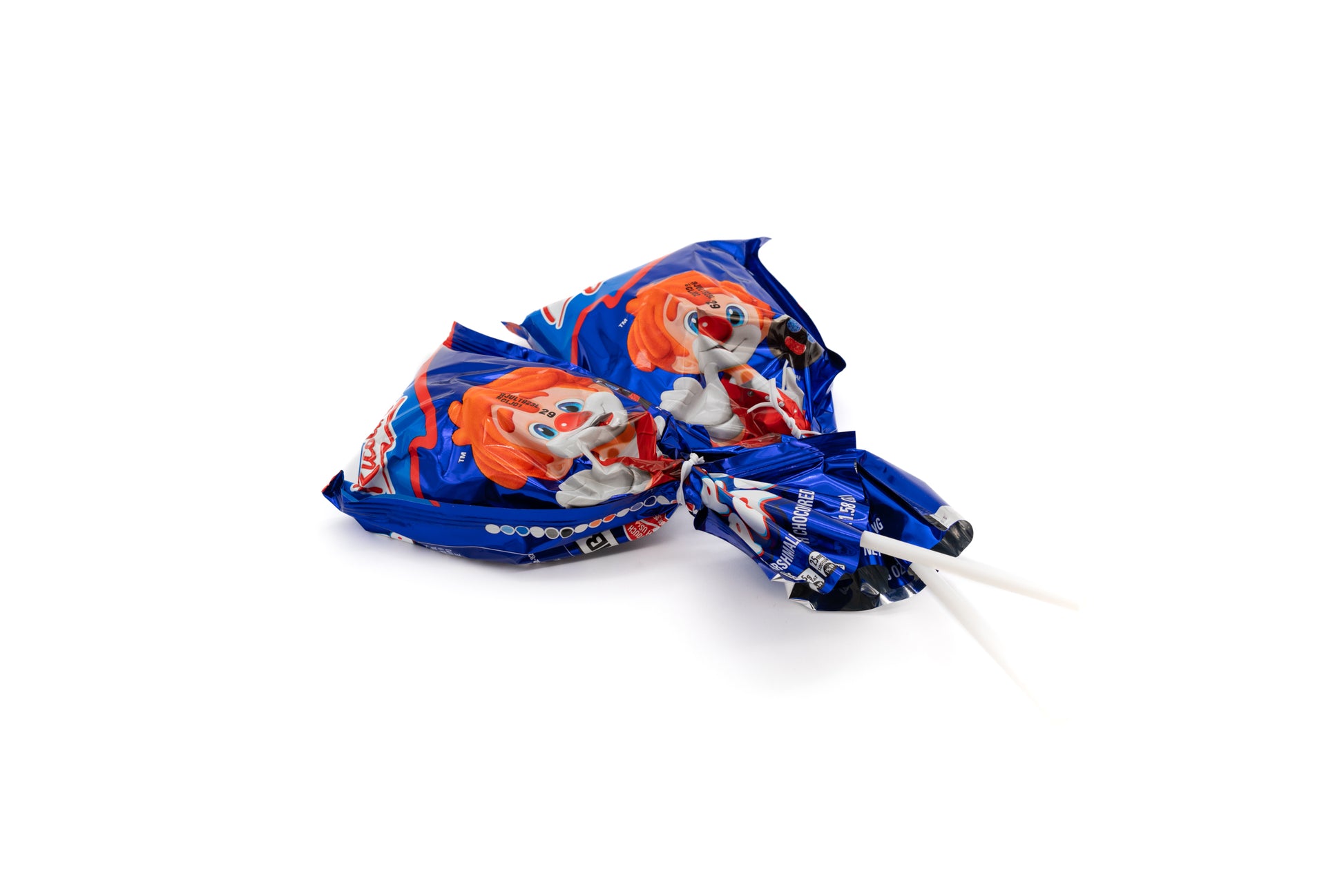 A marshmallow lollipop covered in chocolate and decorated with gummy candies to resemble a clown face.