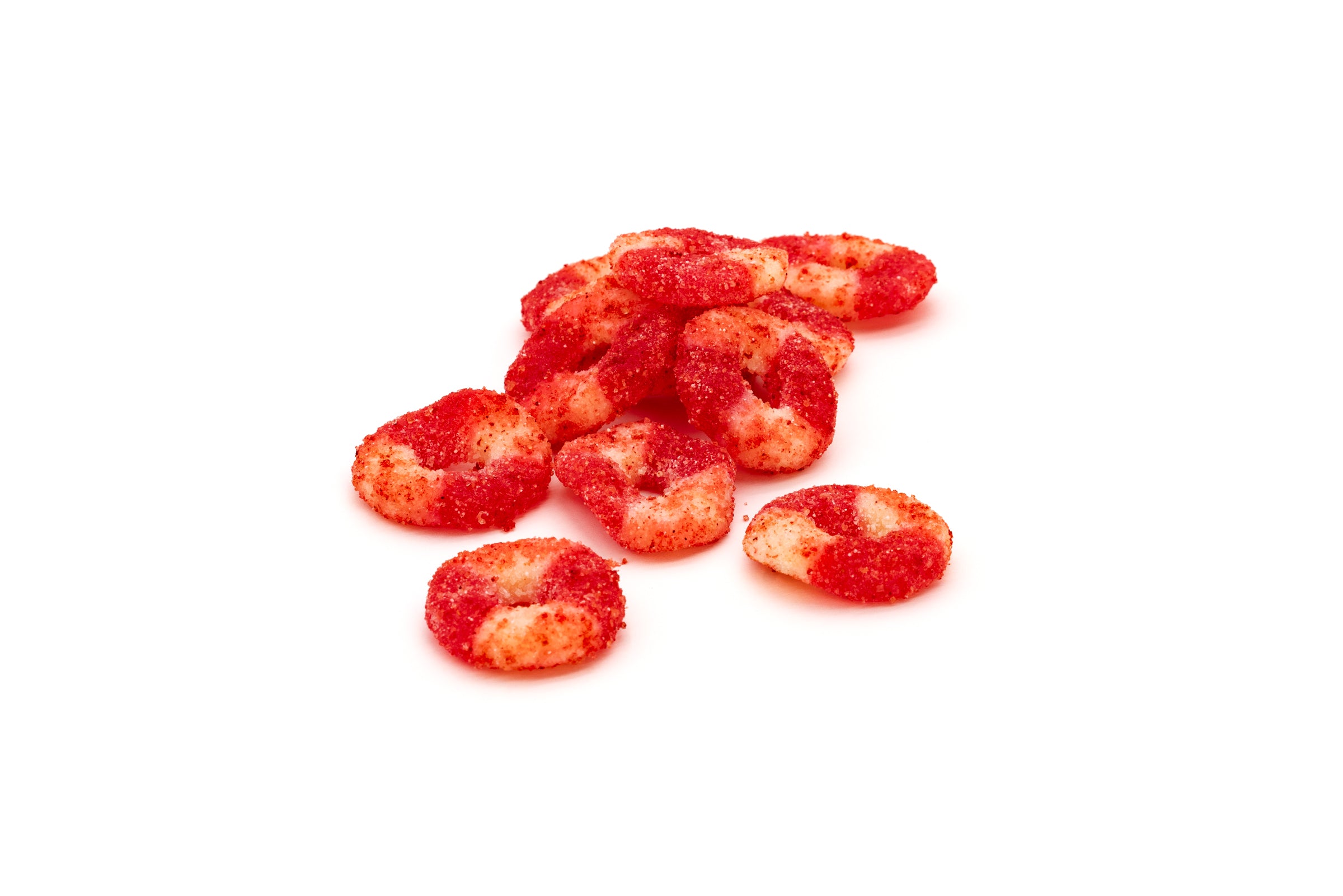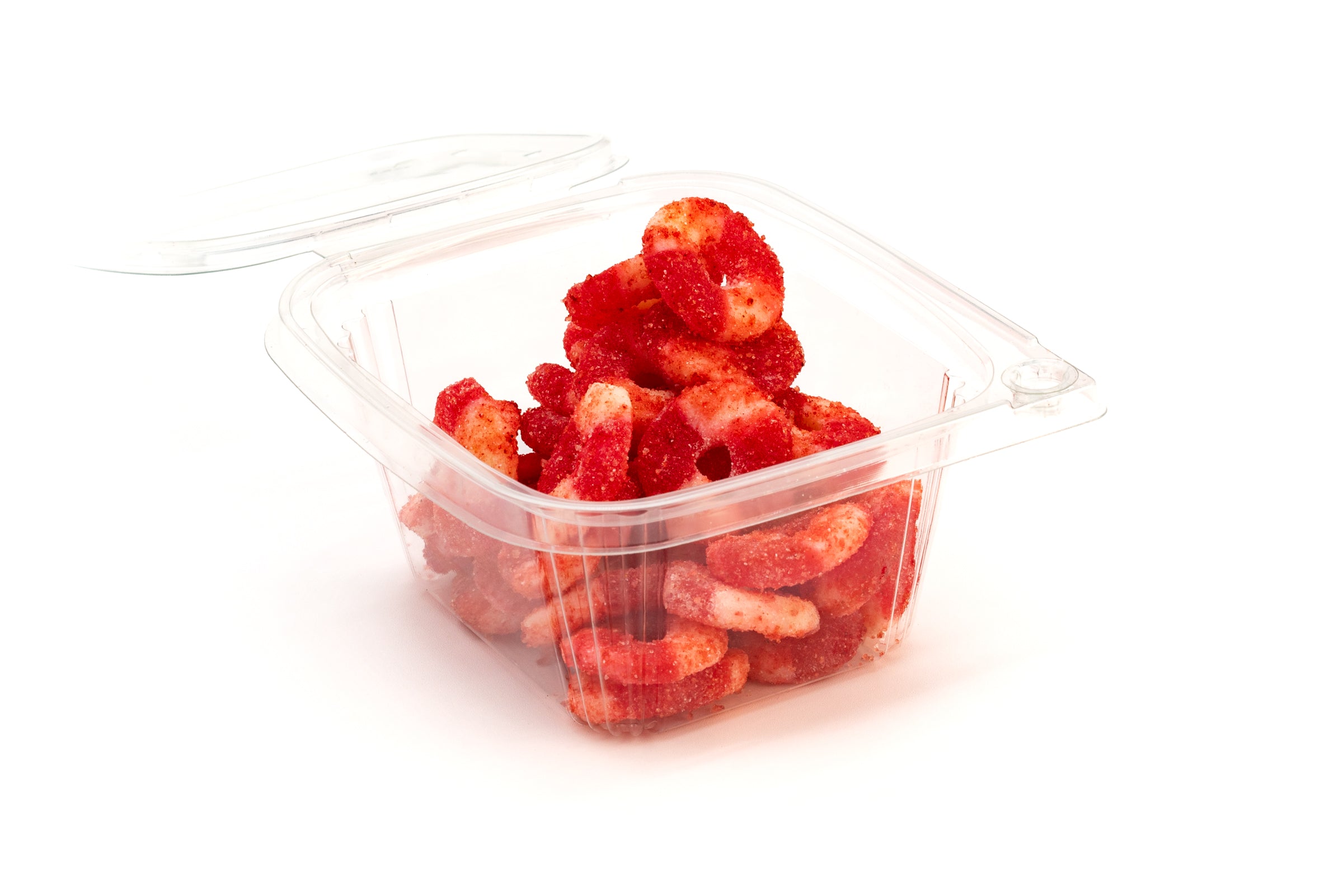 Strawberry gummies coated in a spicy, tangy chamoy sauce.